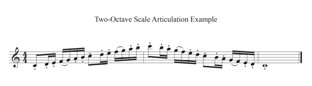 | Scale | 1. Play a scale, arpeggio (tonic), and chromatic across the maximum playable range (ascending & descending) at the suggested tempo (quarter note = 100–144), or as fast as possible to show fluency in the key of your solo piece. 2. If your solo piece is in a minor key, play the melodic minor scale. 3. For atonal or non-traditional pieces, play either F-sharp major or E-flat melodic minor scale. |