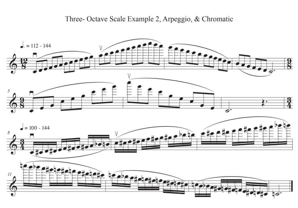 Play the scale, tonic arpeggio, & chromatic at the suggested tempo or as fast as possible, or with a quarter-note metronome marking of 100-144, to demonstrate fluency in the key which your solo audition piece is written in before you perform it. If it is written in the minor key, play the melodic minor.